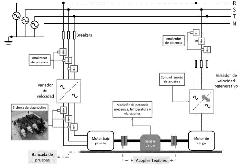 Se empleó un bancada de pruebas de motores (ver Fig. 6) con el fin de controlar el punto de operación (velocidad y par) durante las diferentes pruebas de condición de falla. Se emplea un variador de velocidad ABB ACS800-1 para el control de la velocidad del motor bajo pruebas y un variador regenerativo ABB ACS800-11 para el control del par en modo regenerativo. Ver Fig. 7. Se empleó un motor de inducción trifásico tipo jaula de ardilla Siemens 7.5 HP (5.6 kW) a 220 V conexión en YY, 1732 rpm y FP 0.73; el cual fue acondicionado para generar de manera controlada fallas entre espiras e instaladas termocuplas internas para seguimiento de la temperatura del devanado [25]. En la fase W se extraen nuevas terminales de conexión desde la espira 17, 19, 21 y 23 de tal forma que respecto a la espira 23 pueden conectarse interruptores para generar cortos de 2 (C1) , 4 (C2) y 6 (C3) espiras respectivamente. Por lo tanto, es posible generar tres magnitudes de fallas diferentes en el mismo motor.