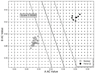 En la Fig. 11 Figura se presenta el mapeo normalizado de los valores AC de la fase A y B cuando se presenta falla C1 en donde claramente se puede diferenciar un comportamiento asociado a la falla entre espiras. Se logra una exactitud de 98.9% además de tener una franja de seguridad bastante amplia demarcada por las líneas punteadas. Al evaluar un segundo vector de datos (ver Fig. 12) se obtiene una clasificación con efectividad del 100%, además de agrupar mejor los datos de prueba.