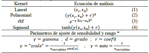 En la Ec. (13) se presenta la función de decisión implementada de la SVM para dos estados de clasificación, en donde y i α i son simplificados a un único coeficiente dual coeficients y ρ es la constante de intersección, ambos obtenidos del entrenamiento; y Κ(x i ,x 0 ) es la función Kernel que opera sobre los n vectores de soporte x i y el vector datos a clasificar x 0 .