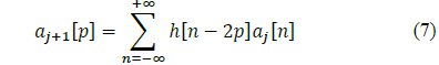 La Transformada Discreta Wavelet (DWT) permite realizar simultáneamente un análisis tiempo-frecuencia, siendo una de las técnicas de uso común en análisis multiresolución MRA (Multi Resolution Analysis). El objetivo de MRA es obtener una proyección de la señal en un espacio vectorial basado en una función de análisis escalable en cada una de las dimensiones asignadas, para así extraer aproximaciones de la señal inicial. En el caso de la DWT, se realiza una proyección a dos espacios vectoriales ortonormales basados en funciones escalables en amplitud y frecuencia, función Wavelet madre, lo que permite tener aproximaciones de la señal en función del tiempo con respuestas características en frecuencia acordes al espacio vectorial al cual se realizó la proyección. Finalmente mediante el Teorema de Mallat se definen los coeficientes de aproximación aj+1 [p] y los coeficientes de detalle dj+1 [p] de la proyección j+1 [27], ver Ec. (7) y (8).