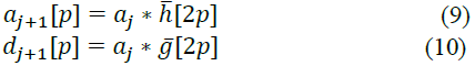los filtros discretos espejos conjugados de descomposición que garantizan la proyección basados en una función Wavelet madre. De manera simplificada las proyecciones son presentadas como la convolución de la señal considerando un factor de escala en el tiempo, ver Ec. (9) y (10), lo que puede ser visto como un submuestreo (↓ 2)