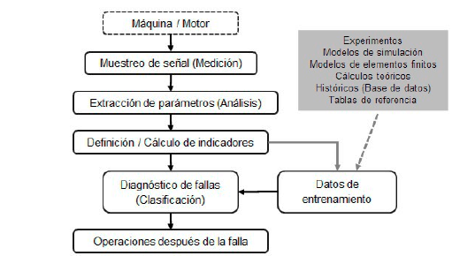 El proceso propuesto realiza una clara separación entre el análisis y la clasificación de las fallas puesto que las diferentes técnicas de análisis desarrolladas para detectar fallas en los motores (FFT, HHT, DWT) finalmente entregan un valor o parámetro al cual realizar seguimiento, pero solo al aplicar una herramienta de clasificación de datos o de toma de decisiones (SVM, distribuciones de probabilidad, etc.) se logra tener un diagnóstico de la máquina. Incluso para herramientas basada únicamente en AI emplean algún parámetro de o indicador de los datos brutos registrados [20].