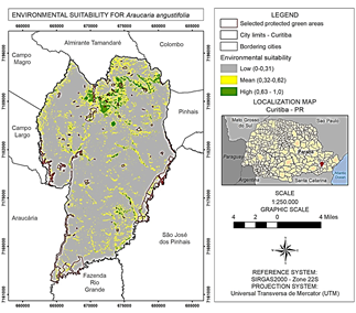 Hence, the results found herein were able to detail the most suitable environments for A. angustifolia in Curitiba, indicating that even though the environmental adequacy for the species is distributed throughout the whole municipality, which was already expected, the northern region presents the best environmental conditions to meet its autecological demands.