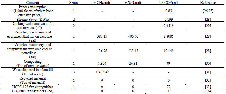 • Scope 1. Direct GHG emissions: Paper consumption; fuel for transportation and machinery operation; administrative, operational, and teaching staff; refrigeration equipment; air conditioning; and fire extinguishers.