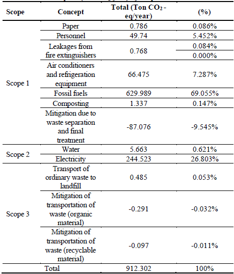 Table 4 shows the Total Carbon Footprint (Ton CO2-eq/year) of each scope and the contribution of each item to this sustainability indicator.