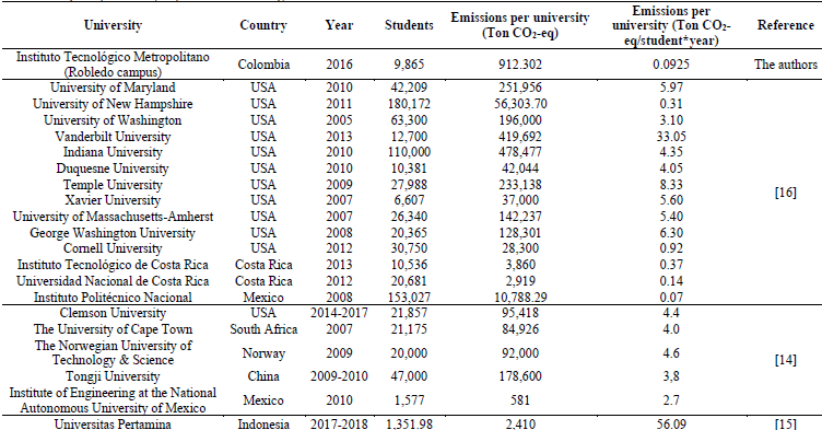 Although it is difficult to compare the carbon footprint of different institutions, Table 5 shows the calculated Total Carbon Footprint (Ton CO2-eq/year) and the specific Carbon Footprint per student at several universities and higher education institutions in the United States and Latin America.