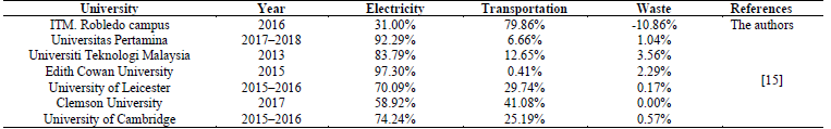 - [15] Ridhosari, B. and Rahman, A., Carbon footprint assessment at Universitas Pertamina from the scope of electricity, transportation, and waste generation: toward a green campus and promotion of environmental sustainability, J. Clean. Prod., 246, art. 119172, 2020. DOI: 10.1016/j.jclepro.2019.119172. [DOI] 🠔