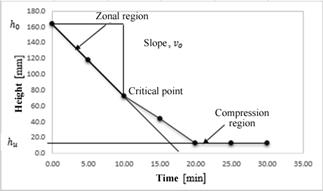 From Kynch method [20], the decanter total area was calculated according to eq. (8), where A t is the total area of the decanter, 1.5 is an overdesign factor, ɸ is the hypothetic inlet flow rate (0.171 m³/h), t u is the experimental retention time 176.32 min, and h o is the initial vessel height 0.678 m. From these parameters, At for V-102 corresponds to 1.109 m².