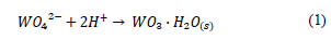 The experiments at the laboratory scale were carried out using 10 mL of a 7500 mg/L tungsten spent EN solution. The tungstite precipitation (WO3·H2O) (eq. (1)) was initially investigated by the addition of analytical grade hydrochloric and nitric acids in a 1:1 (v/v) concentration, at room temperature. The acid dosages found to provide the maximum tungsten recovery under these conditions are described in Table 1. The solid formed was easily recovered by filtration and dried at 90° C for 12 hours in all cases.