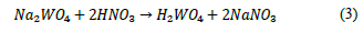 Once the addition of HNO3 was established as the best experimental procedure in terms of tungsten recovery, the amorphous solid was brought into reaction with a Ca(OH)2 0.1 M solution at room temperature (eq. (2)). The insoluble scheelite (calcium tungstate, CaWO4) formed was immediately recovered by filtration with a 73 % purity.