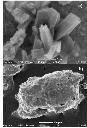 Figure 1: SEM micrograph of the obtained products with HCl (a) and HNO3 (b)