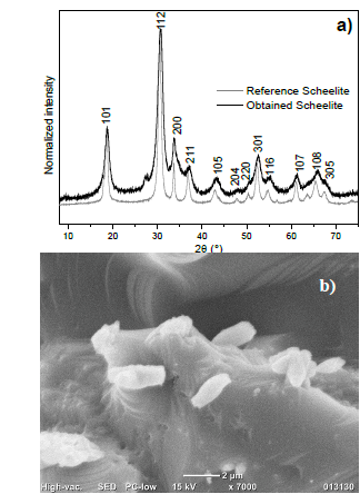 Figure 2: Obtained scheelite XRD profile (a). Obtained scheelite SEM micrograph (b)