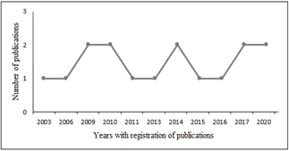 The chronology of publications is represented by an annual average of 0.8 publications, with a maximum of 2 publications per year and for the second decade in study of 21st century, the number of publications per year increased by 167% compared to the first decade (Fig. 1).
