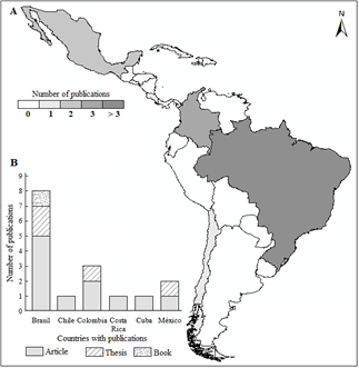 Figure 2: Geographical origin of publications of exergy study and use for wastewater systems in Latin America, 2000-2020. A) Publications by country. B) Number and type of publications by country.