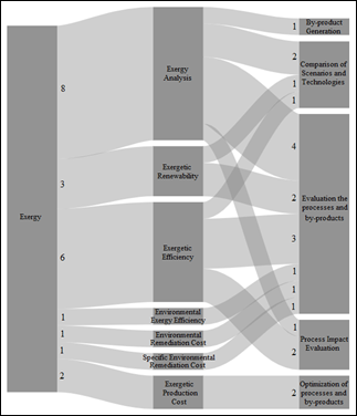 The exergy analysis (36%), exergetic efficiency (27%) and exergetic renewability (14%) have been the main topics of study in LatAm and 23% represents environmental exergy efficiency and the cost of environmental remediation, specific environmental remediation and exergetic production (Fig. 3). The objective of these topics was evaluating the processes and by-products as well as comparing scenarios and technologies.