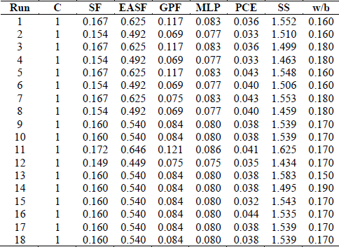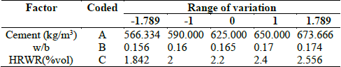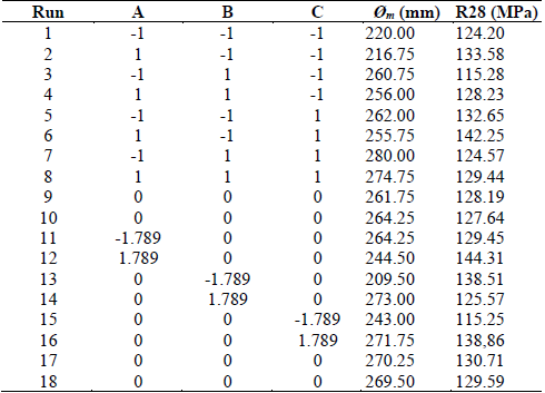 To summarize, three factors were chosen, namely cement content in kg/m3 - coded as factor A -, water to binder ratio (w/b)- coded as factor B -, and the volume of superplasticizer to the total dosage ratio (HRWR) -coded as factor C-. To define the proportion of the other components of the concrete, the A&A mod curve was employed. Two responses were also considered, encompassing compressive strength without special curing conditions at 28 days (R28), and spread flow (Ø m ).