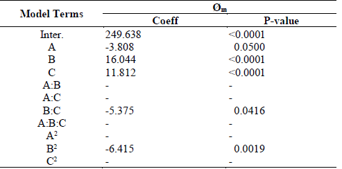 Table 4 shows the set point combinations defined in the CCD and their corresponding experimental response values.