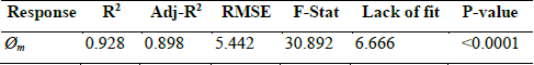 Table 6 shows the results of the analysis of variance (ANOVA) performed in order to investigate the significance of the model for response average slump flow (Ø m ). A p-value lower than 0.0001 was obtained for the model, implying that the model is significant. The model presented a high determination coefficient (R2) explaining 92.8% of the variability in the response Ø m . This indicates the goodness of fit for the model and high statistical significance of the model. Furthermore, the adjusted R2 value is very close to the R2 which shows that the unnecessary terms are not added in the model. The accuracy of the model was evaluated by performing a lack-of-fit test. A non-significant lack-of-fit indicates an accurate model. The p-value obtained by ANOVA implied that the lack-of-fit is not significant compared to the pure-error sum of squares.