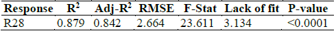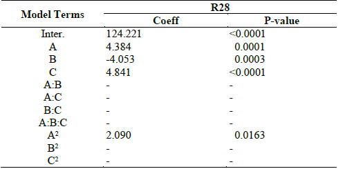 The coefficients of the fitted model for response 28-day compressive strength and its corresponding p-values are depicted in Table 7.