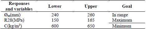 After the model was evaluated, the effect of each factor and their interactions on the response was investigated. RSM plots were established as a simple interpretation of the derived statistical models. The RSM plots were used to compare the trade-off between the effects of factors B and C (i.e. w/b and HRWRA, respectively) on the considered responses. For each response, three graphs were plotted, corresponding to the factor points and the central one for factor A. This means one contour plot for A=-1, i.e. cement content of 590 kg/m3, another graph for A=0, i.e. cement content of 620 kg/m3, and the last one for A=1, i.e. cement content of 650 kg/m3. These plots provide information on the effect of the three factors and their interactions on average spread (Ø m ) and compressive strength with standard curing conditions at 28 days (R28).