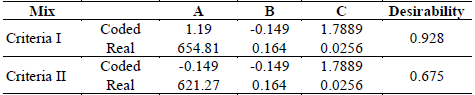 The efficiency of the designed model was evaluated by carrying out the experiment with the selected value of factors and by comparing experimental measured values obtained with those indicated by the mathematical model. Mixture selected by the multi-objective algorithm is presented in Table 10. The comparation between theoretical and experimental results is shown in Table 11. The percentual deviation was employed as a measure of accuracy for validation. Results confirmed that the experimental values agree with the values predicted by the proposed model.