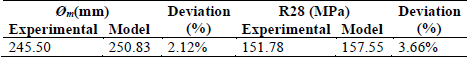 For each response (R28, and Ø m ) a quadratic polynomial regression model based on Eq. (3) was fitted from the DoE design data. The process is then followed by removing the variable with the largest p-value. The procedure continues until only those variables which are significant (p-value<0.05) remain in the model. After removing each term, the fitting process is repeated until all the non-significant terms have been removed from the model. To investigate the significance of the model, an analysis of variance (ANOVA) was performed using R [37]. The results analysis for full regression models included the determination coefficient (R2), the adjusted coefficient of multiple determinations (Adj-R2), the root mean squared error (RMSE), the F Statistic value, the lack-of-fit p-value, and the model p-value. After the model was created, the next step was to verify its efficiency by performing the residual analysis. The latter involves statistical calculation such as residual standard deviation as well as residual plots, in which the adequacy of the selected model can be graphically evaluated. Finally, a comparison of the predicted and real values was depicted. If the test demonstrates an adequate model, the response surface counter can be plotted [29].