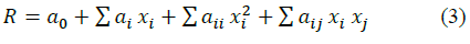 After performing the experiments, a second-degree polynomial equation was used to estimate the responses [34], according to Eq. (3) in the form of: