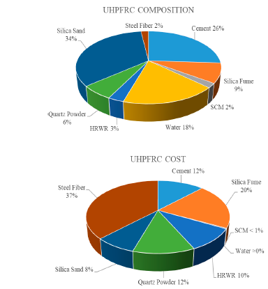 Abellan et al. [9] showed an average UHPC dosage of 150 dosages from scientific articles, sharing the following characteristics: compressive strength over 150 MPa without heat treatment, maximum size of aggregate between 0.5 and 0.6 mm, and 2% of steel fiber content in volume. This dosage and the cost implication of its components is shown in Fig.1.
