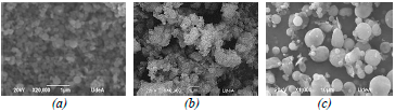 Figure 2: FSEM of supplementary cementitious materials used in research: (a) silica fume; (b) Limestone powder; and (c) locally available fly ash.