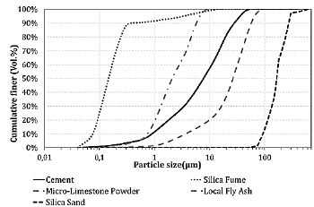 Fig. 3 provides the particle size distribution (PSD) of the cement, silica fume, micro-limestone powder, local fly ash and SS. A polycarboxylate (PCE)-based HRWR with a SG of 1.07 and solid content of 40% was used as a superplasticizer.