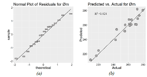 Figure 5: Normal Plot of residuals (a) and Predicted versus Actual values (b) for a fitted model for Ø