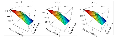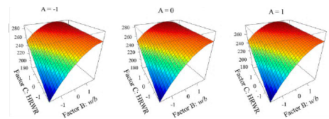 Fig. 8 depicts the RSM plots for 28-day compressive strength response, for different fixed values for factor A.