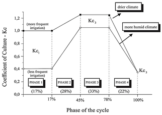 in which (K c ) is the crop coefficient. The values of (K c ) vary with crop type and local climatic conditions. Also according to Fig. 1, the irrigation frequency of a given crop depends on both the type of climate and the phase of the crop cycle. In order to simplify the calculations to be performed by the Operating System of the device, the values of (K c ) for each type of culture will be calculated based on four different stages of crop development [4]. Table 1 shows a description of each of the development stages as well as the corresponding value of (K c ) for each of these stages.