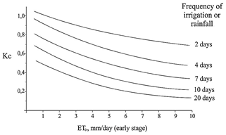 Table 1 shows that among the stages of crop development, the initial stage requires more attention, requiring a more intensive irrigation in this period. The higher the local evapotranspirometric demand or the more sensitive the plant is to the water deficit in the soil, the higher the value of K c the value of K c in the initial stage is mainly related to the evaporation of the soil. Thus, it depends on evapotranspirometric demand and local soil humidity, that is, on the frequency of irrigation or rainfall [4]. Fig. 2 shows the relationship between K c , ET 0 and the frequency of irrigation or rainfall.