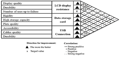 As shown in Fig. 3, the characteristics of the product were the LCD display resistance, the quality of the data storage card and USB connection. Then, through the generation of a correlation matrix, it was observed the interaction between the previously defined product requirements and the technical characteristics, as shown in Fig. 3.