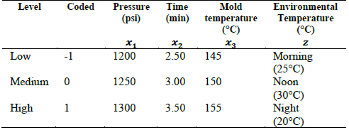 The experimental control factors are the pressure, time and mold temperature. The noise factor is the environmental temperature, which is a factor that can interact with the temperature of the molds causing variation throughout the day. It is desirable to reduce the effect of said factor in the process. Factors and experimental levels are shown in Table 2.