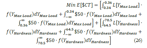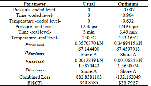 Defining the combined loss as ∑c c = 1 kc [σ2 + (µ - T c ) ] Table 5 shows a comparison of the usual parameters used in the process and the optimal parameters obtained, a reduction in the variation in both the Maximum Load and the hardness is observed. The mean value is closest to the Target value in the two variables. The combined loss is significantly reduced with the use of the optimal parameters. The total expected cost value is reduced with the use of optimal parameters.