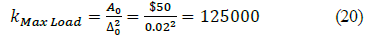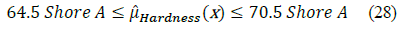 For the application of the experimental scheme indicated in the eq. (8)-(12) the following elements are defined: the cost or loss for repairing a product when it does not meet any of the quality variables is defined asA0=$50. Tolerances for maximum load = 0.35 kN ± 0.01 kN, tolerances for hardness = 67.5 Shore A ± 3 Shore A. therefore the constant k (Max Load) is defined in the eq. (20) and the constant k Hardness is shown in eq. (21).