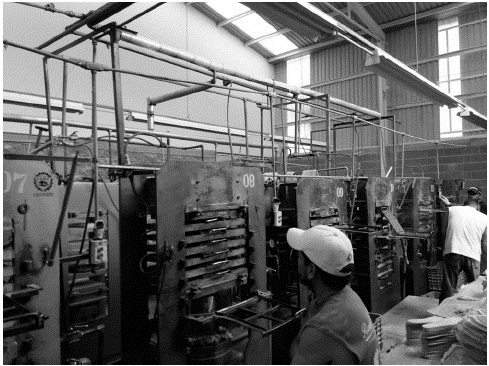 The rubber sole manufacturing process begins with the weighing and mixing of raw materials (raw elastomeric rubber, fillers, carbonate base, silicates, oils, acids and chemicals. The mixing of materials is done in a mill called "bámbury", which works with special blades with temperature. The mixing is carried out in a specific time and a mixture of material in the form of paste is obtained. Subsequently, color pigments and accelerators are added on rotating roller machines. The material obtained is in the form of strips, which are taken to a cooling area. Then, material is brought to the cutting area by means of soles in the shape of the sole. The following process is considered the most important for obtaining quality characteristics, which is vulcanizing (Fig. 3).