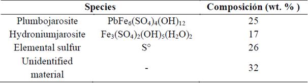 As can be observed in Table 4, the chalcopyrite leaching by-product is constituted mainly of elemental sulfur (S˚), plumbojarosite (PJ), hydroniumjarosite (HJ), and amorphous material (AM), the latter composed mainly of sulfur and amorphous iron and, to a lesser extent, quartz (SiO2) and molybdenite (MoS2). These latter two species are designated as “others” in Table 5.