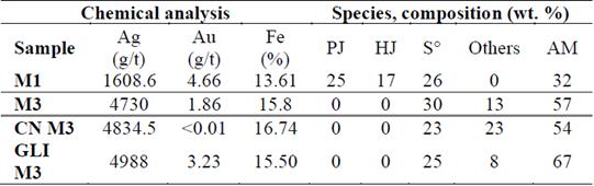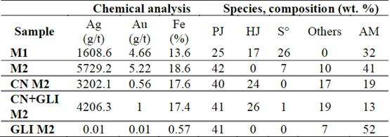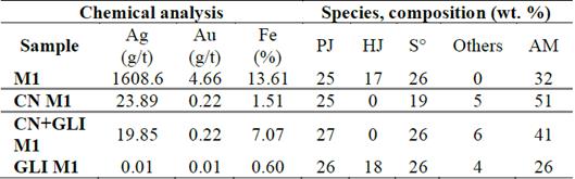 Table 6: Chemical composition and species of chalcopyrite leaching by-product (M1), with desulfurization pretreatment, before (M2) and after leaching with cyanide (CN M2), cyanide+glycine (CN+GLI M2) and glycine (GLI M2).