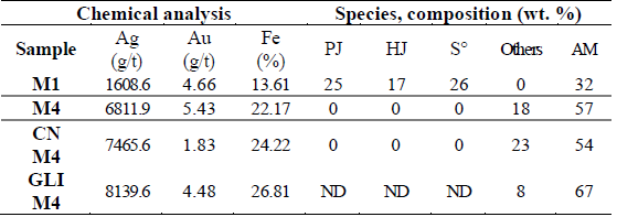 Table 7: Chemical composition and species of chalcopyrite leaching by-product (M1), with peroxidation pretreatment, before (M3) and after leaching with cyanide (CN M3) and glycine (GLI M3).