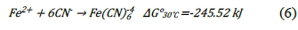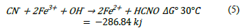 Fig. 5 shows the species distribution diagram for the Fe2+- Fe3+ - CN- system calculated by Medusa software, considering the species concentrations employed in the experiments. As can be observed, the reaction of iron with cyanide decreases the availability of cyanide [19].
