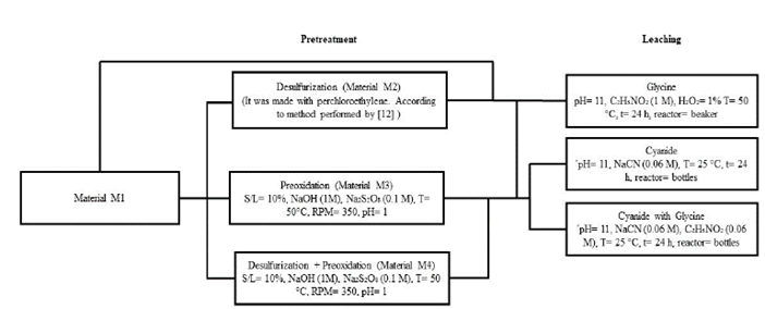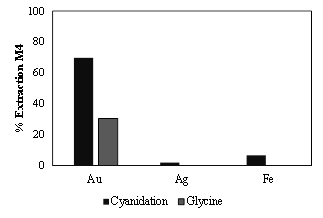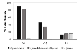The experimental procedure was carried out as follows: first, the Material M1 without any treatment was leached with glycine (C2H5NO2 under certain conditions (C2H5NO2 =1M, pH=11, H2O2=1%, T=50 ºC, t= 24 h), this to determine whether glycine would be used in combination with cyanide.