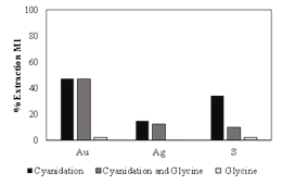 This project was carried out with the objective of studying the extraction of gold and silver contained in these two materials using cyanide, glycine, and a mixture of cyanide and glycine. Although glycine did not have a significant effect on the extraction of gold and silver, it does have a significant effect on cyanide consumption, which has an environmental impact, since the use of glycine would allow the generation of cleaner waste.