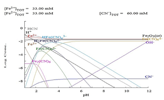 Figure 5: Species distribution diagram calculated by Medusa for the system Fe3+- Fe2+- CN- system.