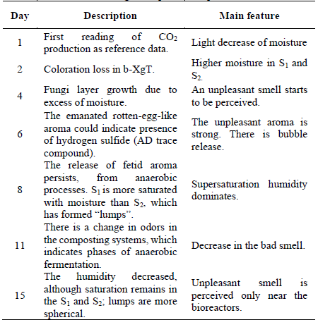 The mounted bioreactors, with a 1:9 ratio of substance and compost, showed the behavior described in Table 4.
