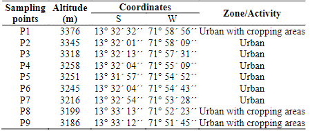 Nine points were selected along the river covering the urban area as shown in Table 1. The points vary from 3376 to 3186 m of altitude, and they are located along of 15.3 km and with a slope of 1.24%. The collecting samples were carried out in the afternoon from 14:00 at 18:00 hours and considering a day without rain.
