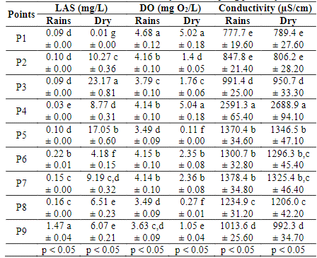 Table 2, shows the results of the LAS surfactant concentration for both seasons at the sampling points. In rains season, the point P9 reported the higher concentration (1.47 mg/L). On the other hand, the concentration of LAS increases downstream from an initial value of 0.09 to 1.47 mg/L, showing a significant difference between the sampling points (p < 0.05).