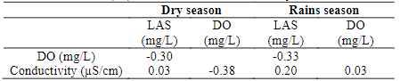 These reported values in most cases are lower than the stipulated by WQS for the conductivity to use as irrigation water [18]. However, the concentration of LAS presents a low positive correlation with the conductivity (Table 3) for dry season (Rs = 0.03) and rains season (Rs = 0.20), this is Ewhy LAS slightly increases conductivity.